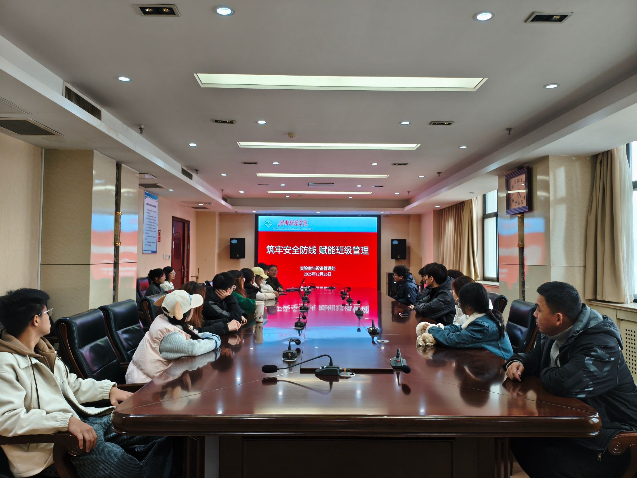 为进一步强化联点班级安全管理效能,提升班委安全责任意识与风险处置能力,筑牢校园安全根基,2025年12月26日下午,实验室与设备管理处组织联点班级全体班委开展安全教育专题活动。实验室与设备管理处副处长葛亚明担任主讲,实验室与设备管理处联点班主任、联点班级全部班委参加培训活动。