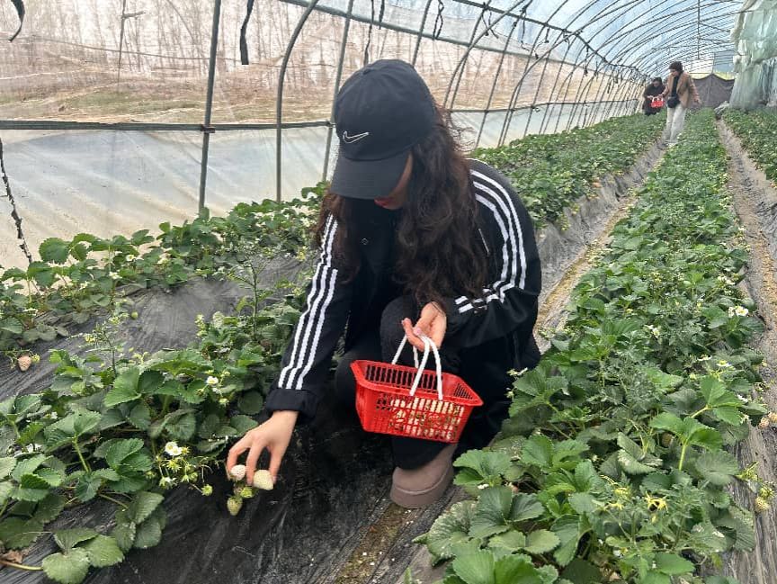 来到草莓园,棚内暖意融融,红艳饱满的果实散发着清甜的果香。女教职工们手提小篮,兴致盎然地穿行于田垄之间,一边精心挑选成熟的草莓,一边分享采摘技巧与生活趣事。大家时而驻足拍照,时而笑语盈盈,平日里紧张的工作节奏在这一刻悄然远去,取而代之的是轻松愉悦与彼此间的温情流动。